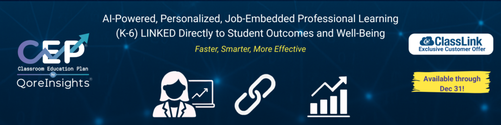 Ensure your Professional Learning (PL) has a meaningful impact on teaching and learning for EVERY teacher and student with the Classroom Education Plan (CEP) by QoreInsights! Empower teachers and leverage student voice and real-time data with AI-driven, job-embedded, personalized PL. Our proprietary needs assessment and instructional strategy-matching supports productive PLCs and measurable growth on benchmarks and well-being.