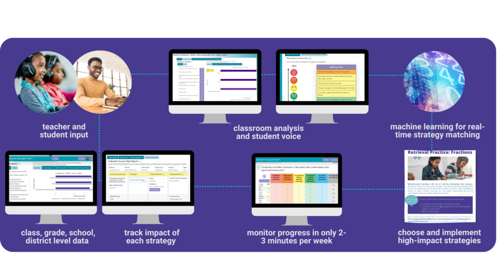 The Classroom Education Plan® (CEP) is a revolutionary platform designed to guide every teacher to the best instructional strategies for his/her students, track the impact of that strategy on each student’s engagement and growth, and enable administrators and teachers to have real-time views into teachers’ and students’ progress. The CEP is based on extensive research into peer-reviewed studies and is based on real-time teacher and -student voice on both academic and non-academic factors. It delivers classroom-ready teaching strategies that are ingrained with social-emotional learning, cultural responsiveness, and differentiation.
